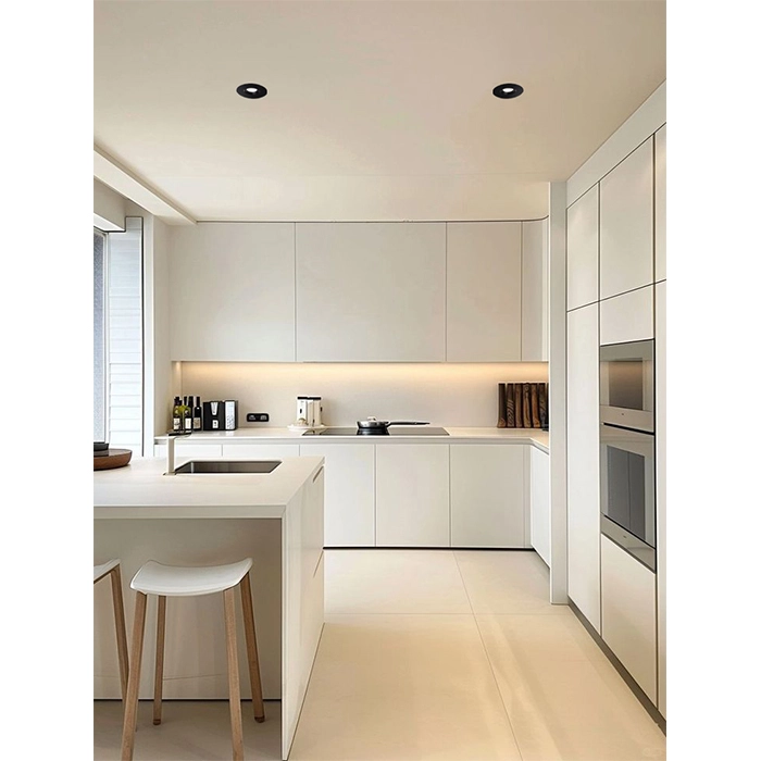 Com um índice de proteção IP20, a sua utilização é indicada exclusivamente para zonas interiores secas, como salas de estar, quartos, corredores ou escritórios. Para a montagem em tetos falsos, é necessário um furo de corte circular com um diâmetro de Ø75 mm. O sistema de fixação é composto por molas laterais robustas que garantem uma instalação rápida, segura e um acabamento perfeitamente nivelado com a superfície do teto.