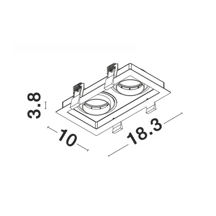 Compatível com lâmpadas LED GU10 ou MR16, o suporte permite uma personalização total da luz de acordo com a finalidade do projeto. Para a sua instalação em tetos falsos, é necessário realizar uma furação retangular com as dimensões de corte de 95 x 180 mm. O sistema de fixação é composto por molas laterais reforçadas que garantem que o conjunto permaneça estável e perfeitamente integrado na superfície do teto.