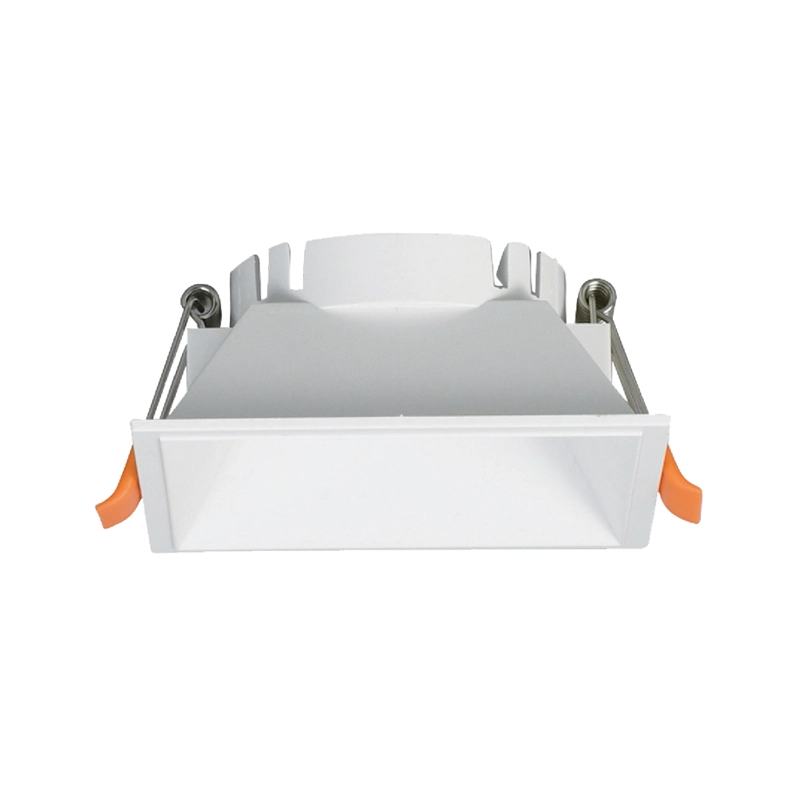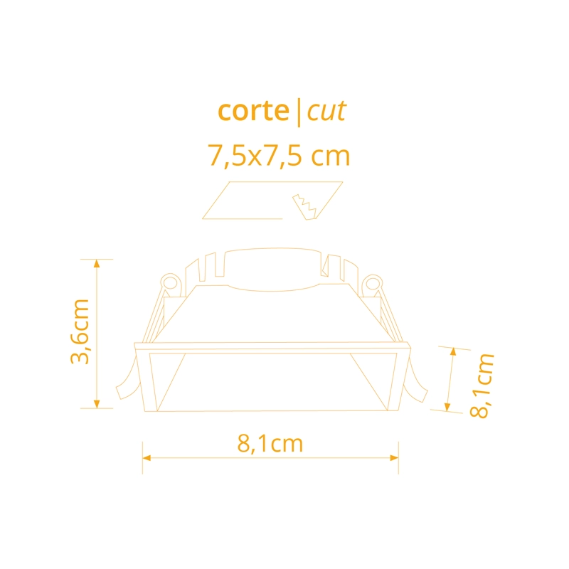 A instalação é simples e segura, exigindo uma dimensão de corte quadrada de 75 x 75 mm no teto. O sistema de fixação é composto por molas laterais robustas que garantem que o aro permaneça perfeitamente nivelado e firme contra a superfície, resultando numa integração arquitetónica limpa e profissional.