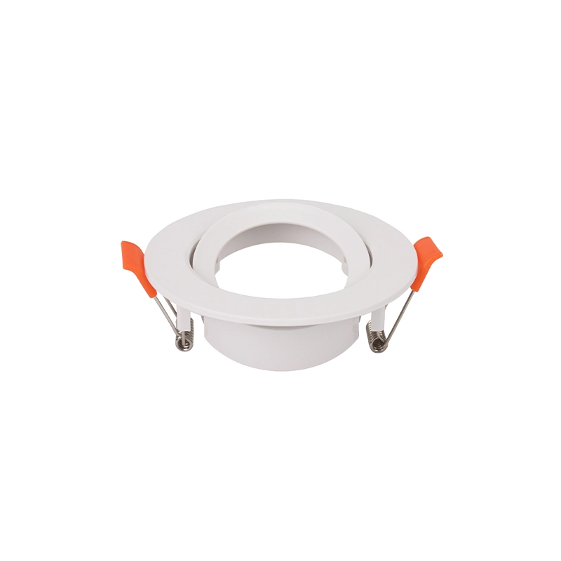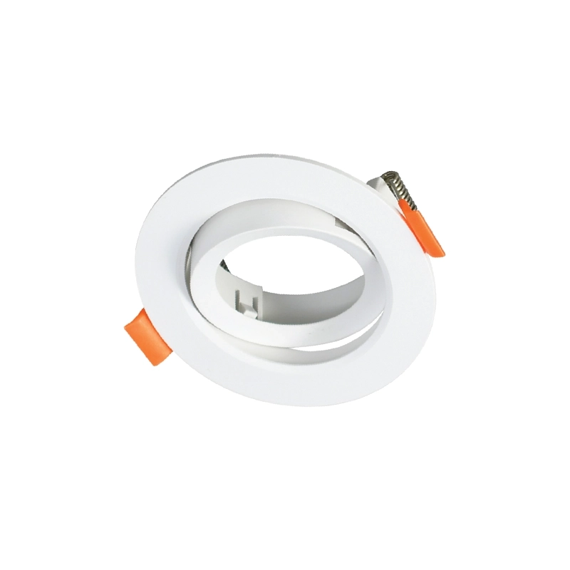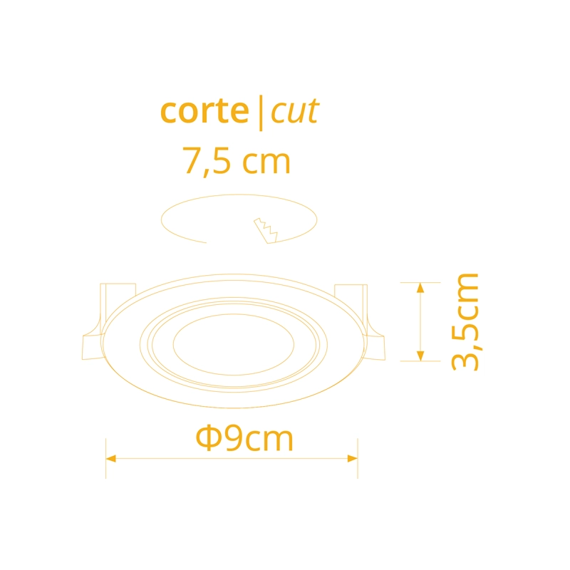 Compatível com lâmpadas LED GU10 ou MR16, o aro oferece flexibilidade na escolha da tonalidade e intensidade luminosa pretendida. A montagem requer um furo de corte circular de Ø75 mm, onde o sistema de molas de pressão assegura uma fixação estável. Estas molas estão equipadas com protetores cor de laranja que garantem uma instalação segura, evitando danos ou marcas no material do teto falso.
