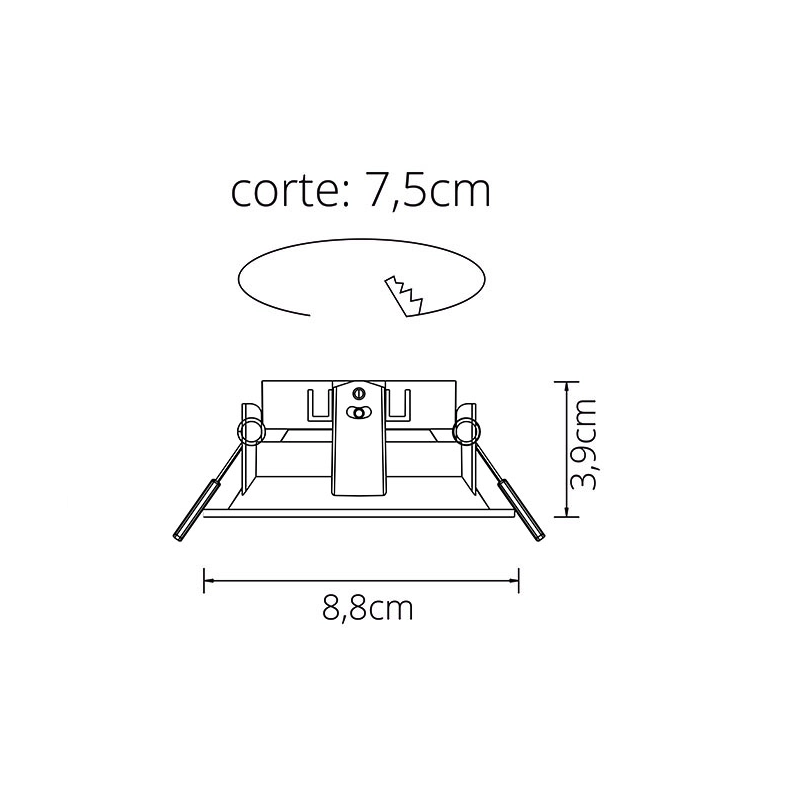 A instalação é efetuada através de um furo de corte circular de Ø75 mm, onde o sistema de molas laterais com terminais de proteção pretos garante uma fixação firme e segura. Este mecanismo de pressão assegura que o aro permaneça perfeitamente embutido e alinhado com a superfície do teto falso, preservando o acabamento impecável da instalação.