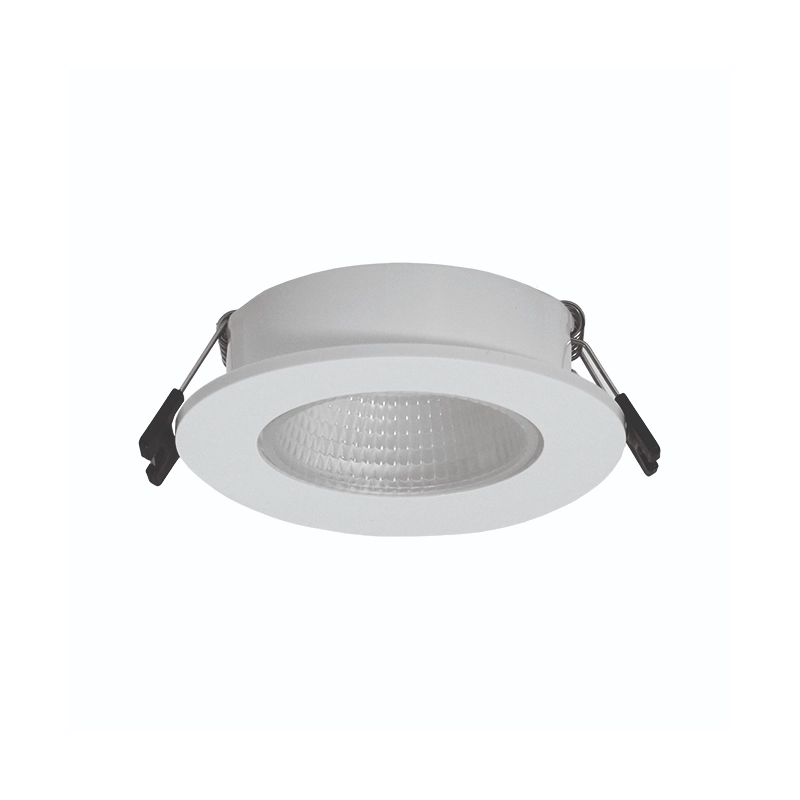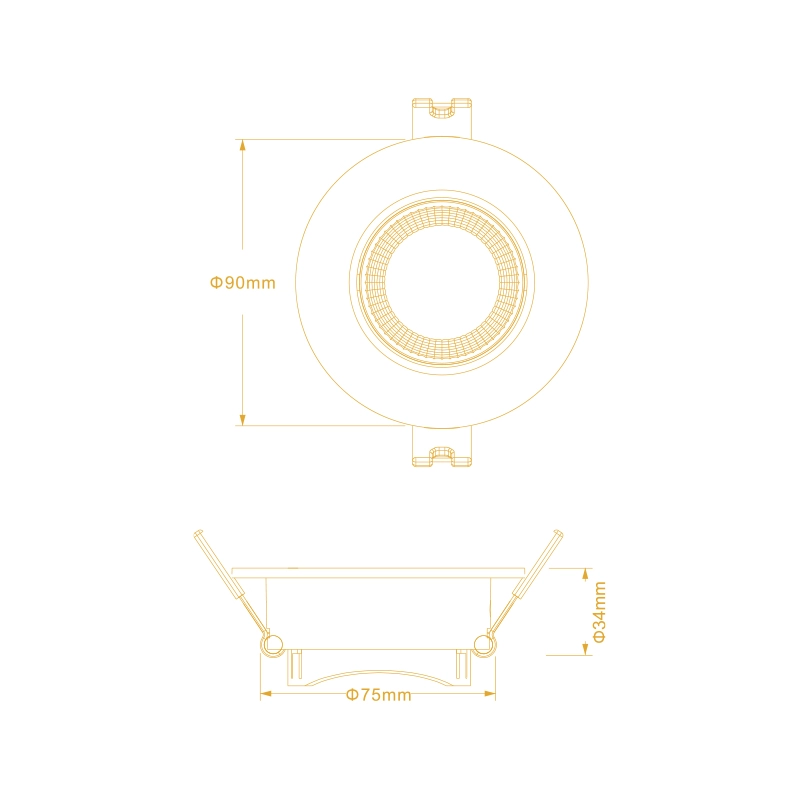 Para a sua aplicação, é necessário um furo de corte circular com um diâmetro de Ø75 mm. O sistema de fixação é composto por molas laterais robustas com terminais de proteção pretos, que asseguram uma montagem rápida e uma pressão constante contra o teto, garantindo que o aro permaneça perfeitamente nivelado e seguro após a instalação.