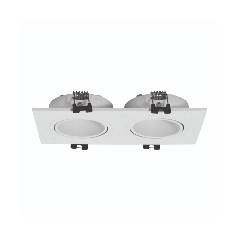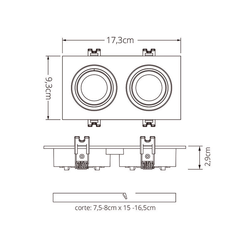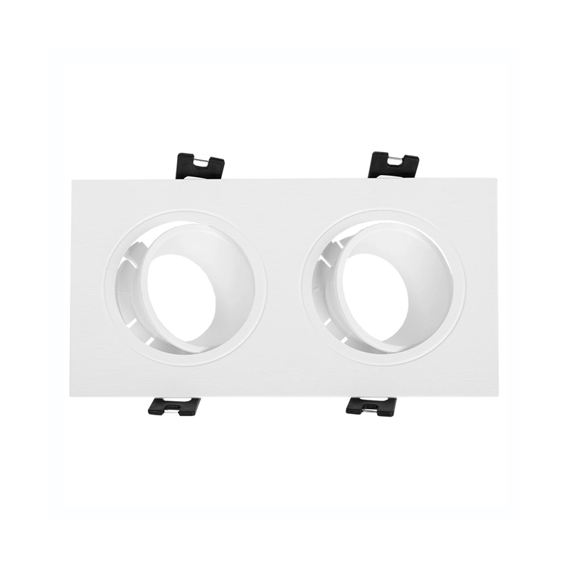 Este modelo é compatível com duas lâmpadas LED GU10 ou MR16, conferindo ao utilizador a liberdade de selecionar diferentes potências ou temperaturas de cor para cada foco. A instalação requer uma furação retangular com dimensões de corte flexíveis, compreendidas entre 75-80 mm de largura e 150-165 mm de comprimento, adaptando-se facilmente a diferentes necessidades de montagem. O sistema de fixação por molas de pressão assegura que o aro permaneça firmemente embutido e alinhado com a superfície do teto.