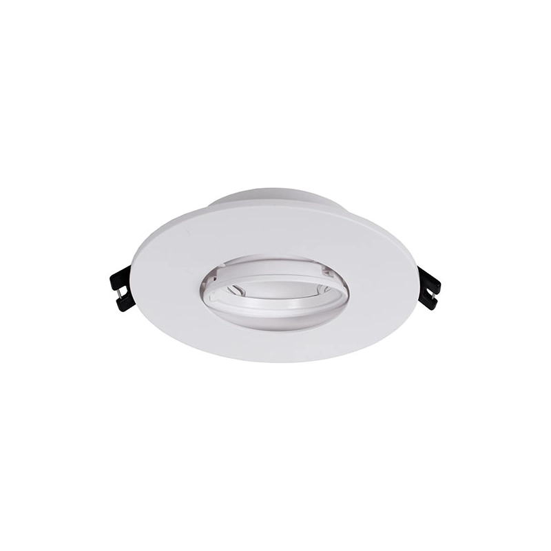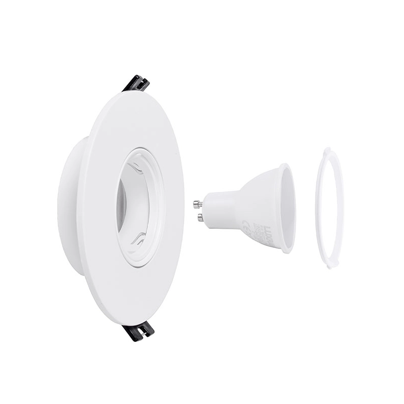 Este modelo destaca-se pela sua flexibilidade de montagem, sendo compatível com dimensões de corte entre Ø75 e 100 mm, o que facilita a substituição de luminárias antigas ou a adaptação a furações já existentes. O aro é compatível com lâmpadas LED GU10 ou MR16, e o seu sistema de fixação por molas laterais garante uma instalação rápida e uma pressão estável contra a superfície do teto.