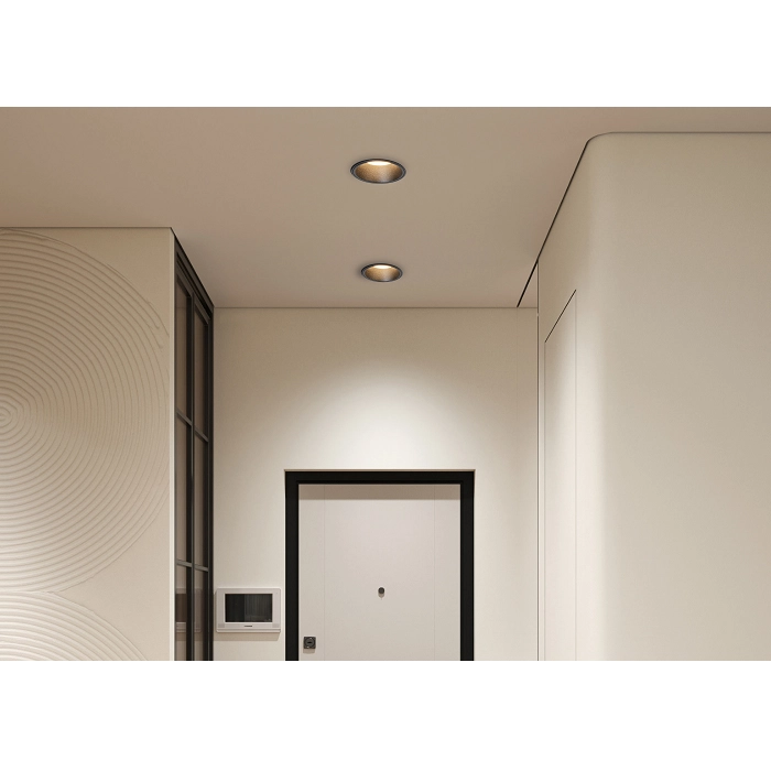 A sua principal característica técnica é o design recuado, que posiciona a fonte de luz no interior do suporte. Esta configuração é ideal para aumentar o conforto visual, uma vez que oculta a lâmpada do campo de visão direto e reduz significativamente o encandeamento no ambiente. Por ser um modelo fixo, projeta um feixe de luz estável e direcionado verticalmente, sendo excelente para criar pontos de iluminação de destaque ou funcional.