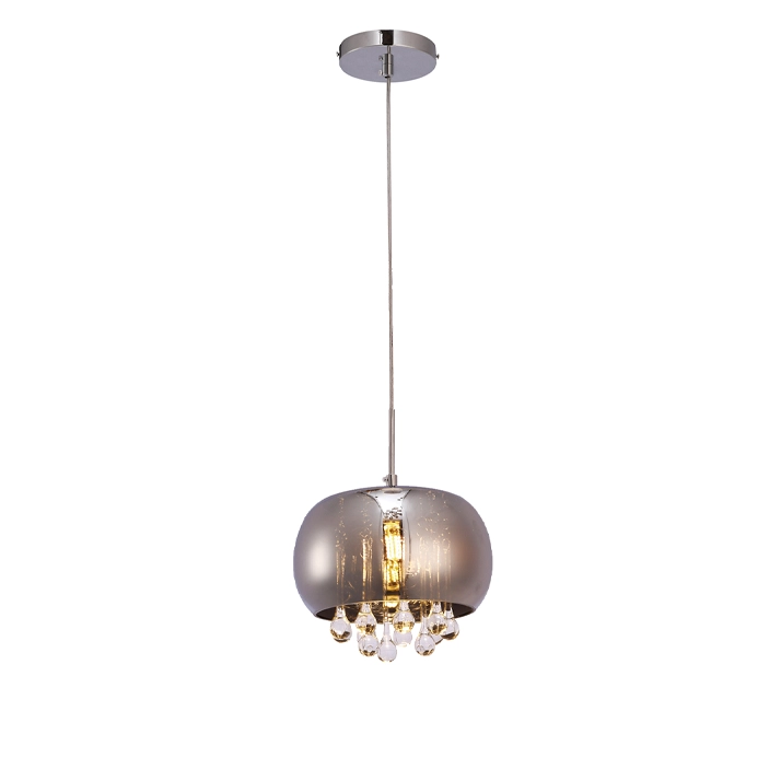 A cúpula de Vidro/Alumínio espelhado cria um efeito visual moderno e sóbrio quando desligada, e quando acesa, revela a luz através do seu acabamento fumado. Os Cristais pendentes garantem um brilho extra e um efeito de dispersão de luz cintilante, tornando-o ideal para ser instalado individualmente sobre mesas de cabeceira, em série sobre balcões, ou em cantos de sala de estar que necessitam de um toque premium de design. O acabamento em Alumínio Cromado (Prateado) reforça a sua estética de alta qualidade.
