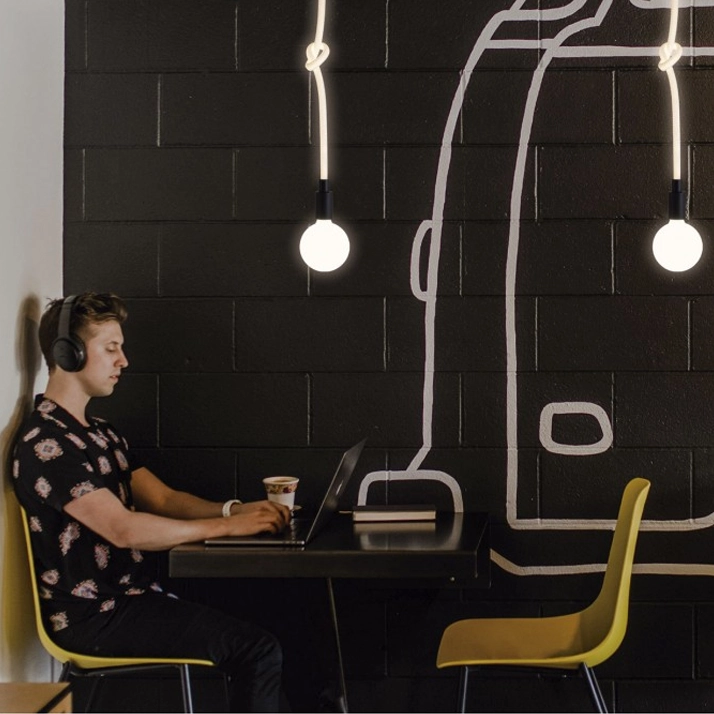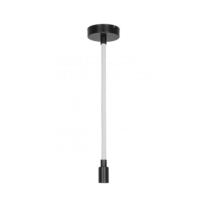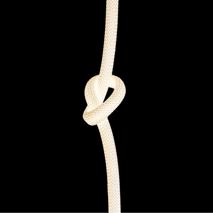 A sua estrutura principal é dominada pela cor Branca e pelo cabo têxtil com nó decorativo, fabricado em Metal e Acrílico. O candeeiro é equipado para uma lâmpada E27 LED (não incluída) na parte inferior, e inclui uma fonte de luz LED integrada de Potência de 11W no interior do “cabo” ou barra suspensa.