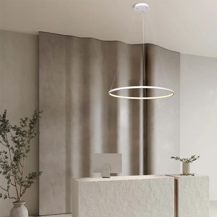 O Candeeiro de Suspensão Minimal 32W Branco CCT3 destaca-se pelo seu design em forma de anel, combinando estética moderna com elevada funcionalidade. Esta peça premium oferece um toque de sofisticação e leveza a qualquer ambiente, sendo ideal para salas de estar, quartos ou zonas de refeições.