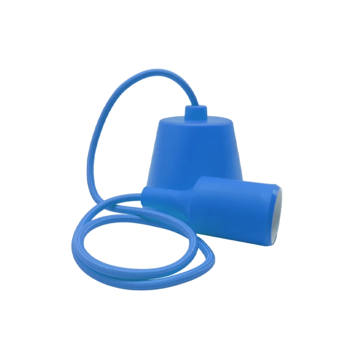 A estrutura completa, incluindo o casquilho cilíndrico e o copo de teto, é fabricada em PVC/Plástico, apresentando uma cor Azul brilhante e calma e um acabamento liso e fácil de limpar. O conjunto é complementado por um cabo têxtil na mesma cor, reforçando a estética monocromática e de design.