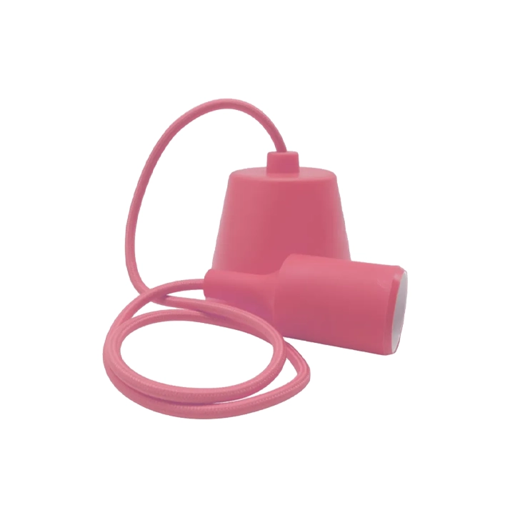 A estrutura completa, incluindo o casquilho cilíndrico e o copo de teto, é fabricada em PVC/Plástico, apresentando uma cor Rosa delicada e suave e um acabamento liso e fácil de limpar. O conjunto é complementado por um cabo têxtil na mesma cor, reforçando a estética monocromática e de design simples.