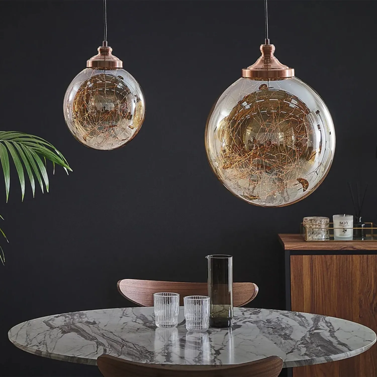Crie uma iluminação decorativa acolhedora e espetacular com o nosso Candeeiro de Suspensão Esfera LED Star Premium. Esta luminária é uma peça de design moderno que combina a elegância da cor Bronze no topo de Alumínio e no casquilho, com o charme intemporal de uma esfera de Vidro com tom Âmbar.