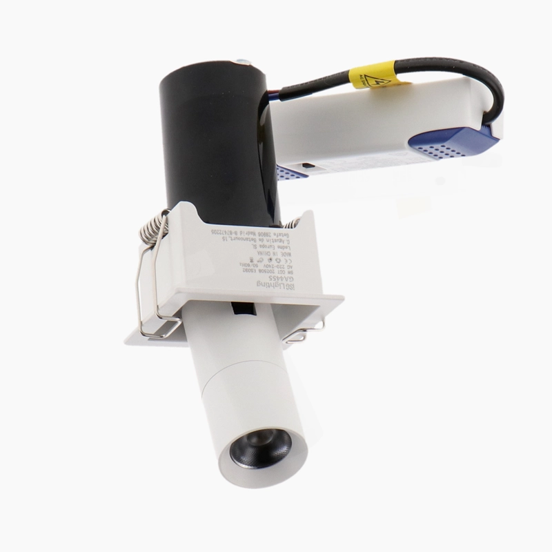Este modelo destaca-se pela sua estrutura basculante e extensível, que permite retirar a fonte de luz do plano do teto e direcioná-la com precisão para objetos ou áreas específicas. Com um índice de proteção IP20, é indicado para zonas interiores secas, utilizando um sistema de fixação por molas que assegura uma instalação estável e segura.