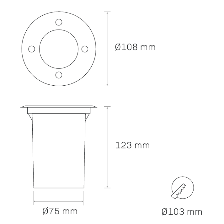 Com um diâmetro de corte de Ø103 mm, é simples de instalar e proporciona uma fixação segura e estável no chão. A classificação IP67 garante proteção total contra poeira e resistência à imersão temporária em água, tornando-o ideal para jardins, caminhos e áreas próximas a piscinas.